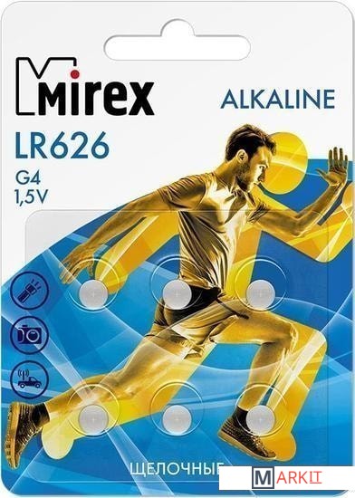 Батарейка Mirex LR626 производится по специальной технологии “AntiLeaX», что при соблюдении условий хранения и эксплуатации сводит риск вытекания электролита практически к нулевым показателям. Элемент LR626 взаимозаменяем с подходящими ему по форме аналогами, которые располагают маркировкой «AG4» или «LR66» на своём корпусе.