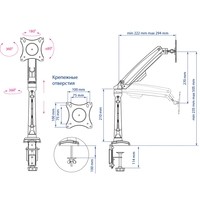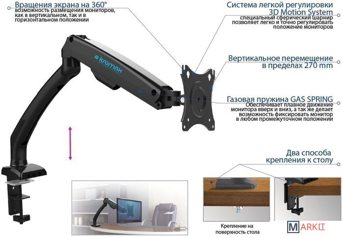 | Функциональные особенности | поворотный, с регулировкой высоты, кабель-канал, струбцинное крепление |