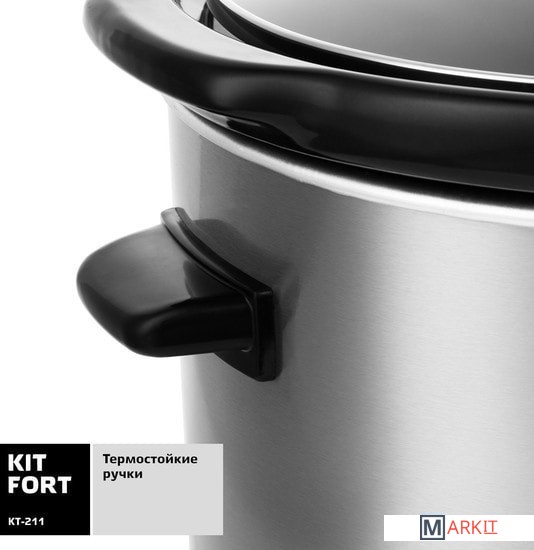 Медленноварка Kitfort KT-211 — это простой в пользовании кухонный прибор с большим диапазоном применения. Она состоит из двойного корпуса, внутри которого по периметру расположены нагреватели, и керамической кастрюли с крышкой. Если в обычной кастрюле пища варится, а на сковородке жарится, то в медленноварке происходит немного другой процесс — томление. Температура приготовления лежит в диапазоне 60–120°С в зависимости от режима и особенностей готовящегося блюда. Благодаря такому температурному диапазону вода почти не испаряется, а продукты медленно тушатся в собственном соку, сохраняя практически все витамины и полезные микроэлементы.2 режима нагрева + подогрев уже готовой пищи.